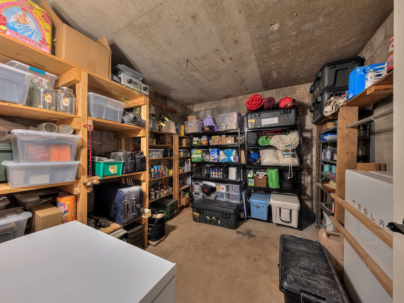 This utility storage space features concrete walls and ceiling, reflecting a utilitarian and industrial atmosphere. Wooden and metal shelving units line the perimeter, arranged efficiently to maximize vertical storage. The shelves hold a mix of clear plastic bins, boxes, canned goods, camping supplies like rolled blankets and sleeping bags, and various tools and equipment, suggesting a multipurpose storage usage. The floor is bare concrete, maintaining the raw, functional vibe. An energy storage unit labeled “TESLA” is mounted on a wooden frame on the right side. Overall, it demonstrates practical and organized storage for household essentials and outdoor gear.