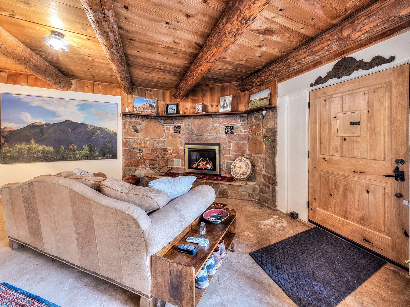 This inviting living space features exposed wooden beams and a rich wood-paneled ceiling that enhances its rustic charm. A stone-clad corner fireplace creates a warm focal point, complemented by an assortment of framed artwork and objects on a wooden mantle ledge. Opposite the fireplace, a soft beige upholstered sofa offers comfortable seating, facing inward to encourage conversation or relaxation. The entry door is solid wood with decorative carving above it, and a dark mat anchors the entrance. The earthy tones throughout, combined with natural materials, create a cozy, lodge-like ambiance perfect for intimate gatherings or quiet moments by the fire.