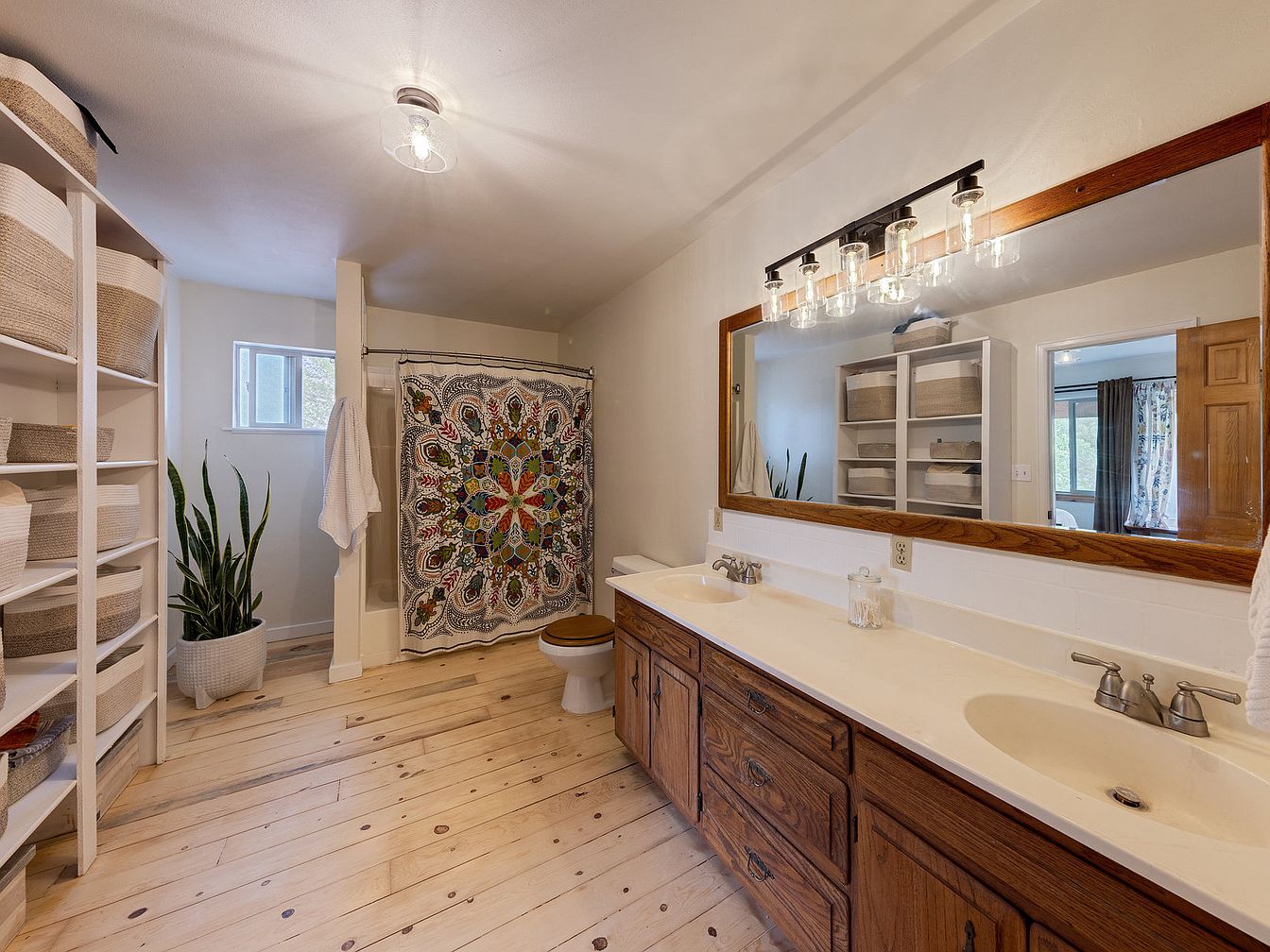 This spacious master bathroom features a warm, rustic aesthetic with natural wood flooring and a large wooden vanity housing dual sinks. Above the vanity is a wide mirror framed in matching wood, complemented by a contemporary row of glass light fixtures providing ample illumination. To the side, an open shelving unit holds woven baskets for storage, maintaining an organized and cozy atmosphere. The shower curtain boasts a vibrant, intricate pattern that adds color and personality, while a green plant near the window brings a touch of nature indoors. Neutral walls and simple fixtures keep the design clean and inviting.