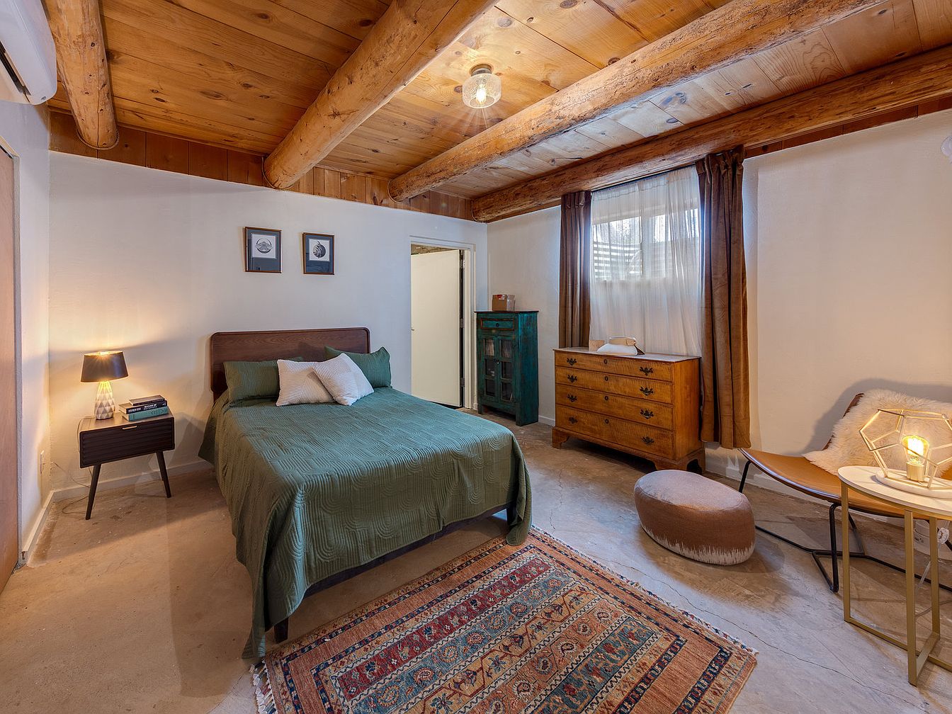 This intimate bedroom features a rustic aesthetic with exposed wooden beams and natural wood paneling on the ceiling that contrasts warmly against smooth white walls. A green quilted bedspread anchors the space, paired with simple pillows and a streamlined dark nightstand with a small lamp providing soft illumination. A patterned rug adds texture and vibrant hues to the polished concrete floor. Furnishings include an aged wooden dresser under a curtained window, a painted teal cabinet, and a minimalist sitting area with a leather chair, fur throw, geometric lamp, and a plush ottoman, balancing comfort with understated charm.