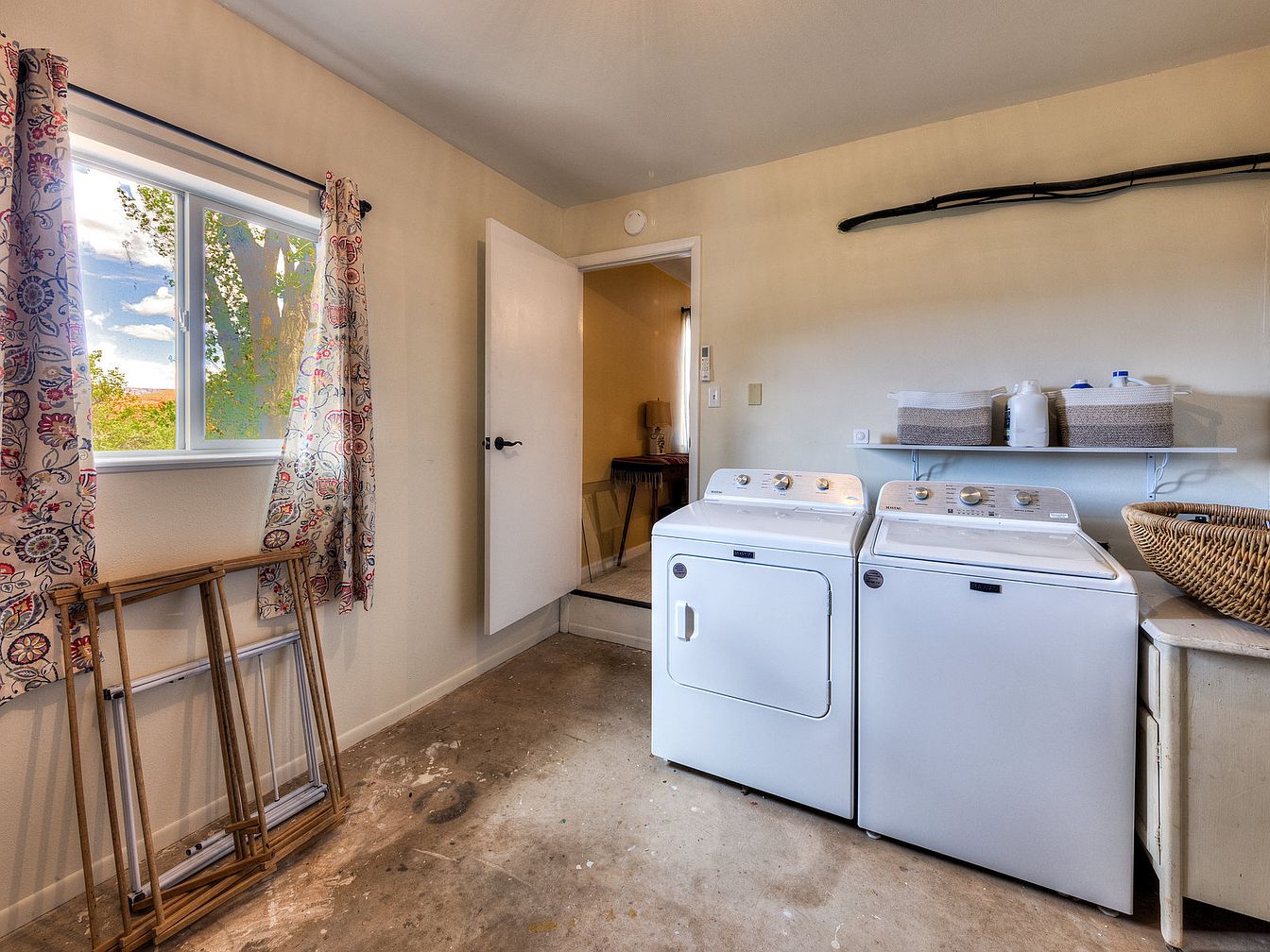 This laundry room is designed with practicality in mind, featuring a matching white washer and dryer set positioned side by side along one wall. Above them, a simple white shelf offers storage for laundry essentials, with baskets and detergent bottles neatly organized. The flooring is unfinished concrete, adding an industrial touch to the space. Neutral beige walls create a warm backdrop, softly illuminated by the natural light streaming through a window on the left, adorned with floral-patterned curtains in subtle reds and blues. A wicker laundry basket and a small side table add to the room’s functionality and rustic charm.