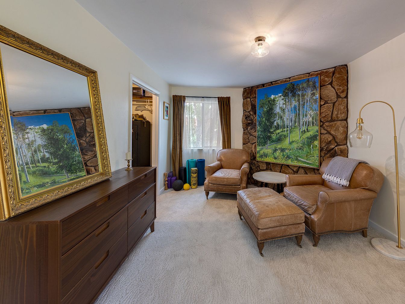 This intimate corner offers a warm sitting nook featuring two vintage-style leather armchairs paired with a matching ottoman. Positioned against a rustic stone accent wall, the arrangement centers around a nature-themed painting that enhances the earthy ambiance. Soft neutral tones dominate the carpeted floor and walls, contrasting elegantly with the rich brown leather furniture and wooden dresser. A large gilded mirror atop the dresser reflects light, adding depth, while the window with sheer curtains brightens the space naturally. Additional touches include a modern gold arc floor lamp and subtle accents like a small side table and fitness props tucked neatly by the window.