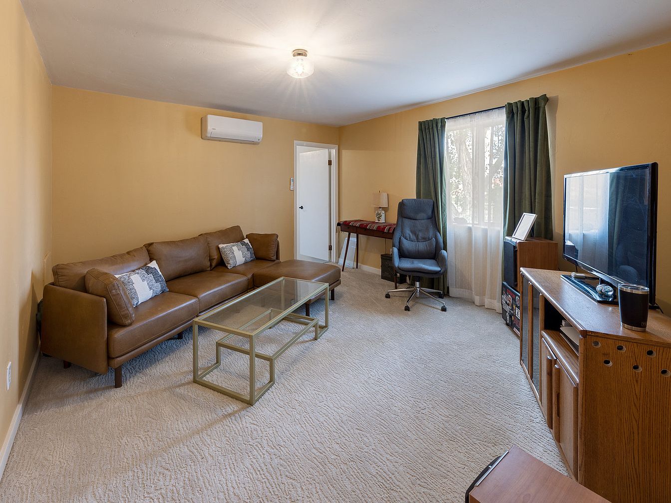 This comfortable living room features warm beige walls paired with a light, plush carpet that softens the space. A rich brown leather sectional with simple, modern lines anchors one side of the room, adorned with neutral-toned pillows for added texture. Opposite, a wooden entertainment unit holds a flat-screen TV, balancing the room with natural wood tones. A sleek glass coffee table with a metallic gold frame sits in the center. The room is brightened by natural light streaming through a window draped with deep green curtains over sheer white panels. A black office chair and a small table with a lamp fill one corner, creating a functional and inviting atmosphere. An airy ceiling light completes the understated, cozy aesthetic.