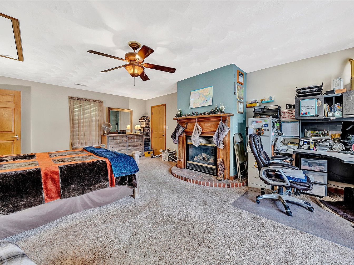 This spacious bedroom integrates a cozy living area and an efficient home office. Beige carpeting extends throughout, contrasting softly with the pale neutral wall colors, with one accent section near the fireplace painted in muted teal. The wooden fireplace mantel, surrounded by a low brick curve, is adorned with seasonal stockings and small decorations, providing a warm focal point. A large wooden dresser sits beneath a window with sheer taupe curtains that diffuse natural light. The bed is covered in a vibrant patchwork blanket with rich hues of orange, black, and deep blue. A ceiling fan with wooden blades enhances comfort. The office corner features a black L-shaped desk, piled with papers, multiple filing systems, and an ergonomic leather chair on a plastic mat, blending work and restful elements seamlessly.