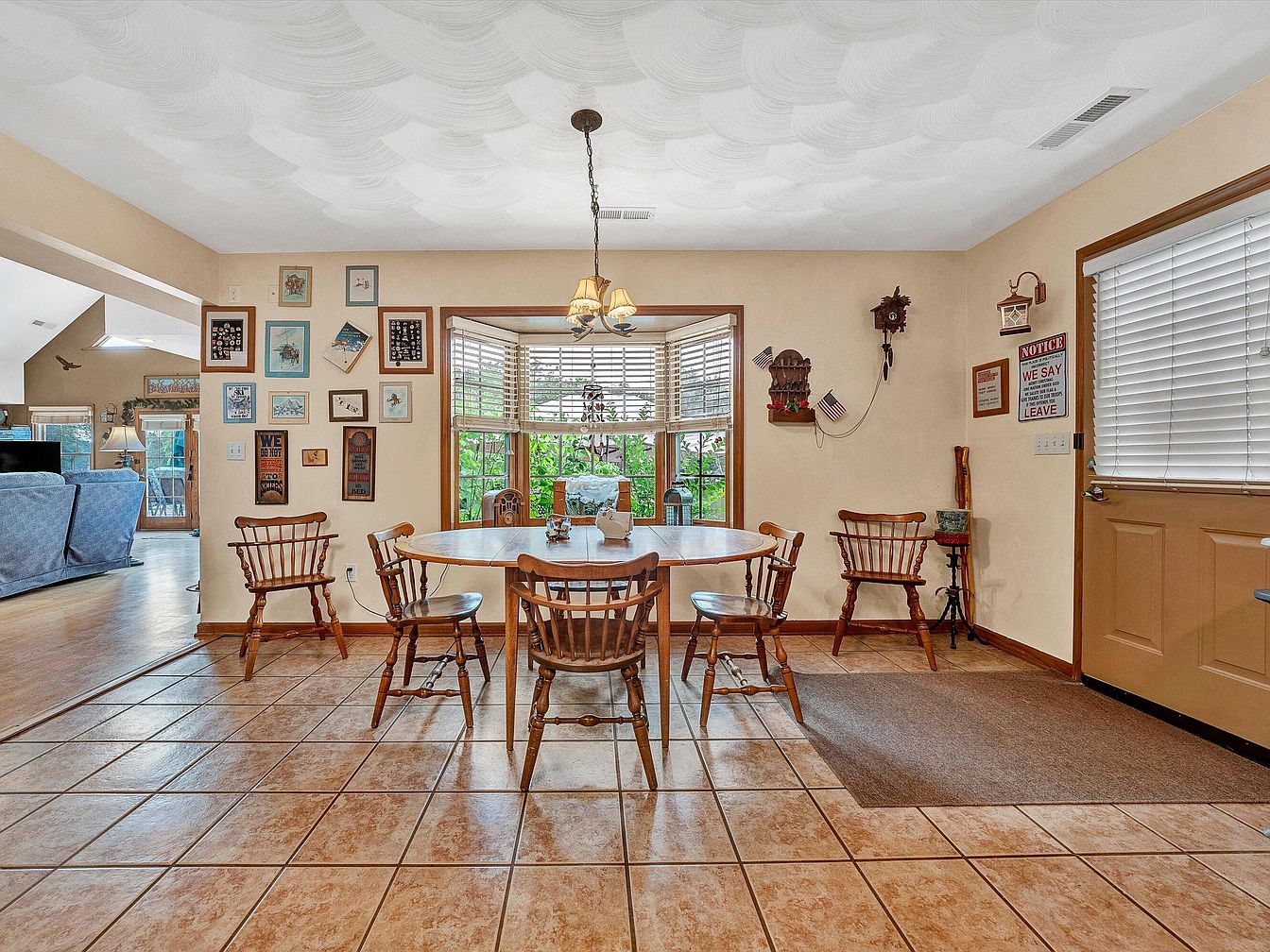 This dining space centers around a classic wooden oval table surrounded by six spindle-back chairs, offering a rustic and inviting atmosphere. The bay window brings abundant natural light, adorned with horizontal blinds that frame lush greenery outside. Warm beige walls serve as a neutral canvas, accented with an eclectic collection of framed art and vintage signage, adding character and a personal touch. The ceiling features a subtle stucco swirl pattern, complementing the tiled floor in earthy tones that enhance the cozy, homey feel. A small chandelier above the table and tasteful wall decor complete the charming setting.