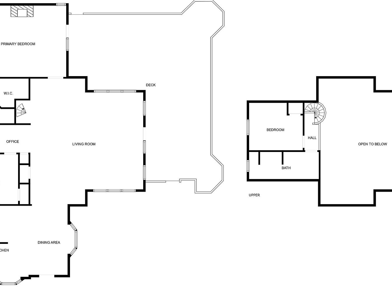 This floor plan presents a spacious and thoughtfully designed home with a clear division between living and private areas. The main level features a large living room centrally located, flowing into a deck outdoors and adjacent to a dining area with angled windows for natural light. The kitchen is positioned conveniently next to the dining space. The primary bedroom includes a walk-in closet and is situated for privacy, near an office space. Upstairs, the layout reveals one bedroom connected to a bath, with a hall and spiral staircase leading to an open area that overlooks the living room below, adding an airy and open design element.