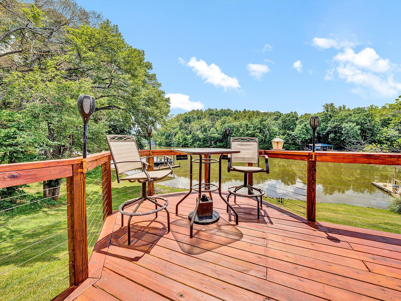This inviting outdoor deck offers a relaxing space elevated above a lush green lawn and a tranquil body of water. Constructed from warm-toned wood, the decking has a rich, reddish hue that complements the natural surroundings. The railing features sturdy wooden posts with sleek horizontal steel cables, providing unobstructed views of the river and dense treeline beyond. Furnished with two cushioned, swivel counter-height chairs and a simple round metal table designed for casual gatherings, the space balances function with peace. Additional tiki-style lights are attached to the railing posts, enhancing ambiance for evening use.