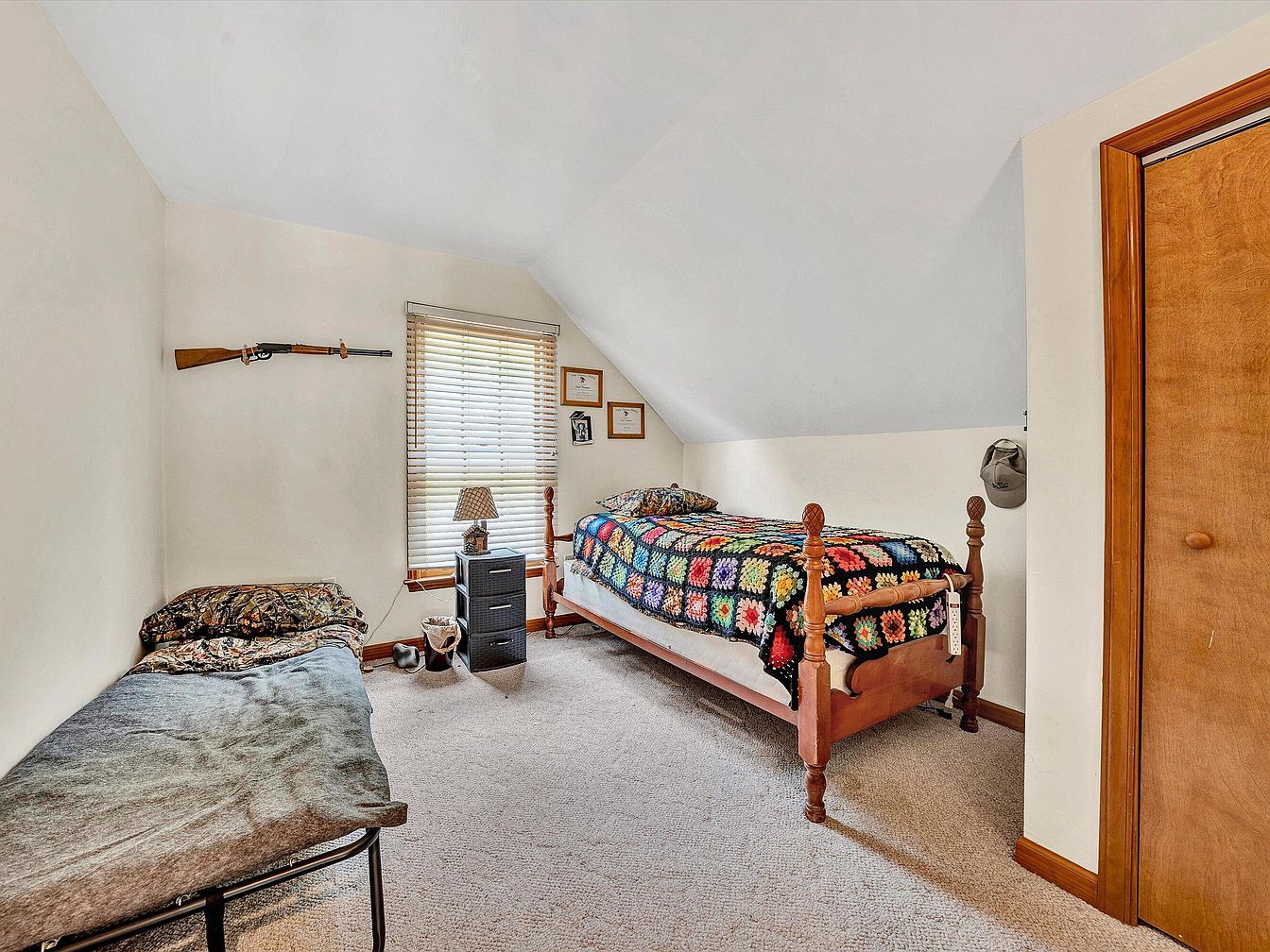 This intimate bedroom features a sloped ceiling that adds architectural character, complementing the neutral beige walls and carpet. Two beds are positioned with thoughtful spacing: a wooden framed twin bed adorned with a colorful crocheted quilt rests against the right wall beneath the slant, while a simple metal frame bed is set along the opposite wall, covered by a patterned blanket. A window fitted with light wood blinds allows natural light to filter in, illuminating the modest nightstand with a small lamp. The room’s natural wood trim and door contrast warmly with the soft, cozy atmosphere.