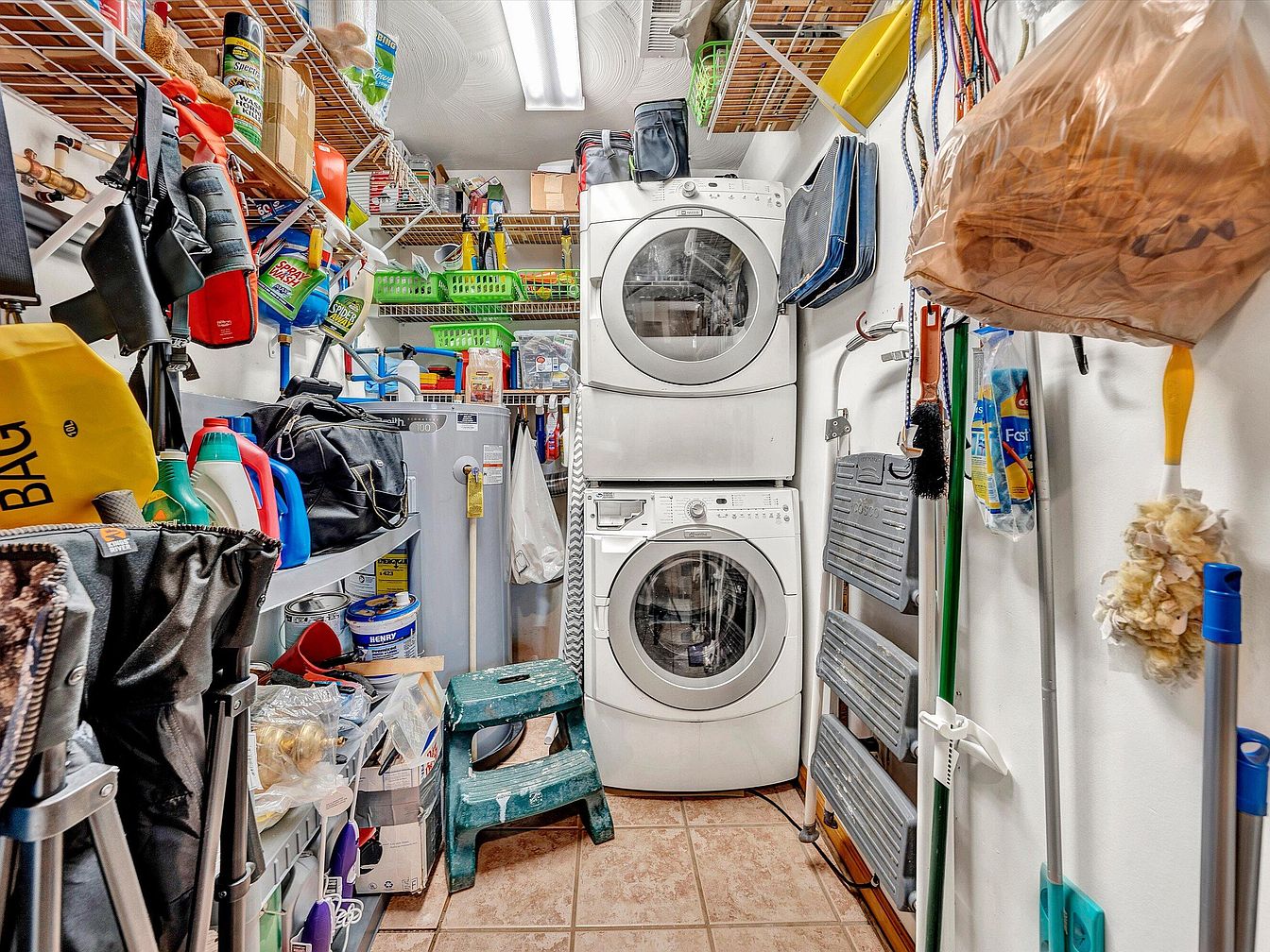 This compact laundry room efficiently combines functionality with storage. A stacked white washer and dryer unit stands against the back wall, optimizing vertical space. Surrounding the appliances are numerous wall-mounted wire shelves stocked with cleaning supplies, tools, and household essentials in a variety of colors, creating a busy yet organized atmosphere. The floor features tan ceramic tiles that complement the white walls, while practical items like brooms, mops, and a step stool are neatly arranged along the sides. This space balances utility with a deliberate attempt at organization, despite the multitude of stored items.