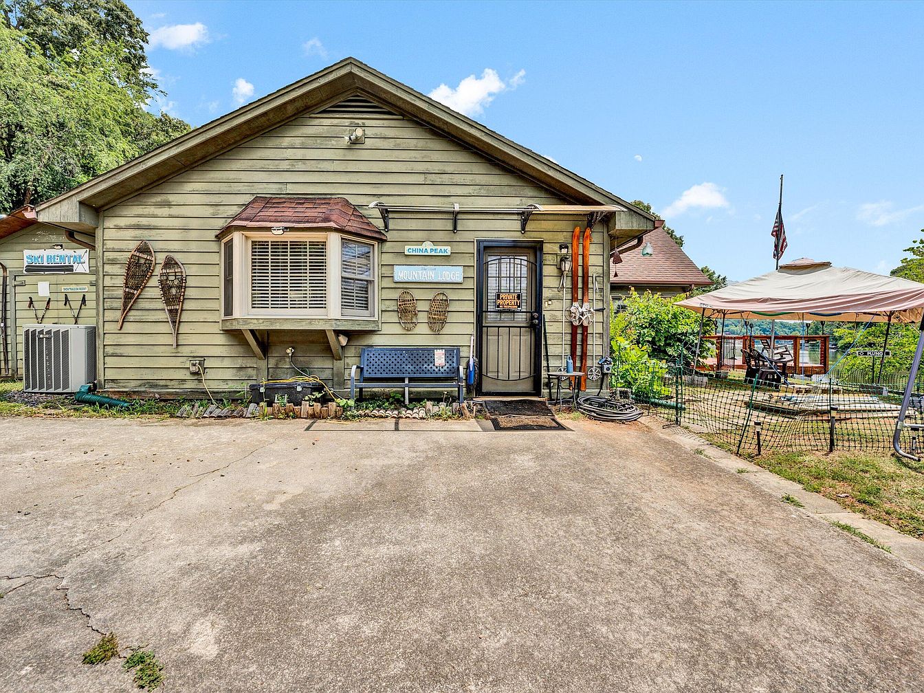 A cozy and rustic front patio area of the house, featuring weathered sage-green wooden siding and a brown shingle roof extension above a bay window with white blinds. A sturdy black metal door with a protective screen leads inside, marked by a “Private Property” sign. The space includes charming vintage ski decor such as old snowshoes and skis mounted on the exterior wall, evoking a mountain lodge atmosphere. A blue perforated bench offers seating, while an adjacent canopy tent provides shade for outdoor lounging beside a fenced grassy section. The concrete driveway and mature greenery complete the inviting exterior.