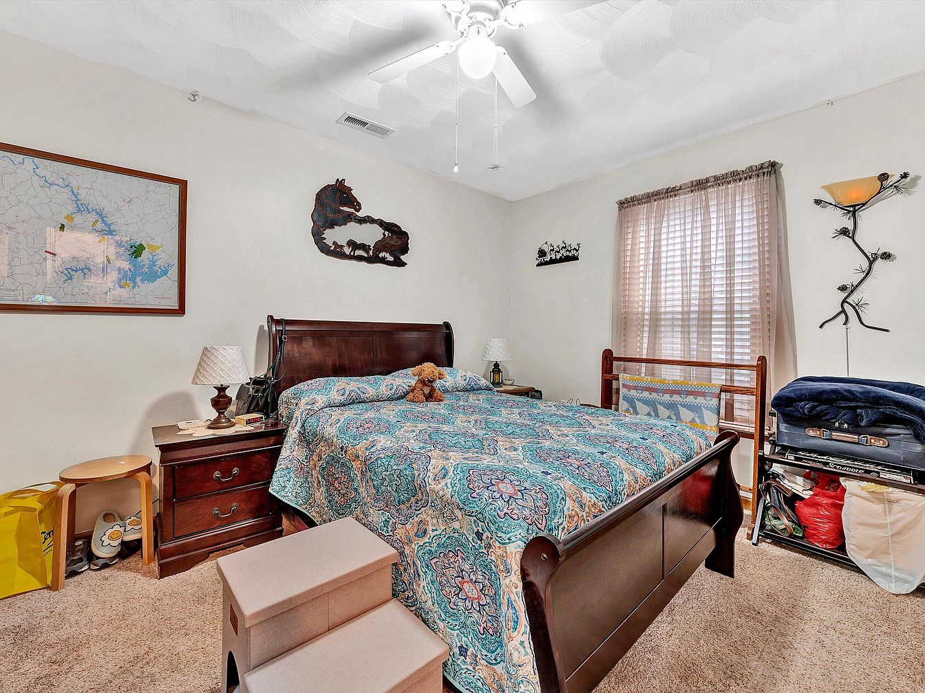 This cozy master bedroom centers around a dark wood sleigh bed framed by matching nightstands. A vibrant, patterned bedspread in teal, blue, and coral tones adds color against the neutral cream walls and beige carpet. A ceiling fan with a light fixture brightens the room, complemented by a table lamp and a distinctive wall-mounted lamp with a nature-inspired metal branch design. A framed map and metal artwork featuring horses provide personality to the space. Soft sheer curtains filter the daylight, while practical touches like pet stairs and organized storage showcase daily living comfort and functionality.