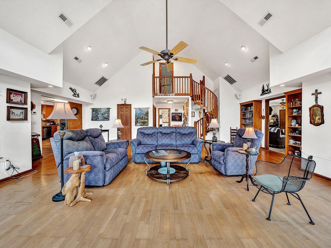 This spacious living area features vaulted white ceilings accented by recessed lighting and a central ceiling fan with wooden blades. The floors are a warm light hardwood, complementing the neutral walls. Seating includes a set of plush, blue-gray upholstered sofas and armchairs arranged around a round wooden coffee table with a glass inset. Beside the sofas, rustic wooden side tables with contemporary lamps provide ambient lighting. In the background, a charming wooden spiral staircase leads to an upper level, framed by an open loft space with wooden railings, enhancing cozy and inviting aesthetics with touches of classic and rustic decor elements.