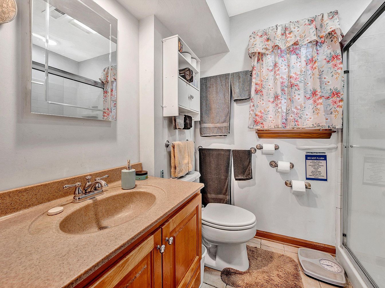 This bathroom features a warm, inviting atmosphere with a soft beige countertop and sink integrated into a natural wood vanity, complemented by polished chrome faucets. White walls and a large mirror contribute to the room’s bright and open feel. Above the toilet, a white cabinet offers practical storage, neatly organizing towels and personal items. Multiple towel racks with gray and beige towels provide convenience. A window is dressed with a floral curtain, adding a splash of color and softness to the space. The adjacent glass shower door and neutral floor tiles complete the functional yet charming aesthetic.