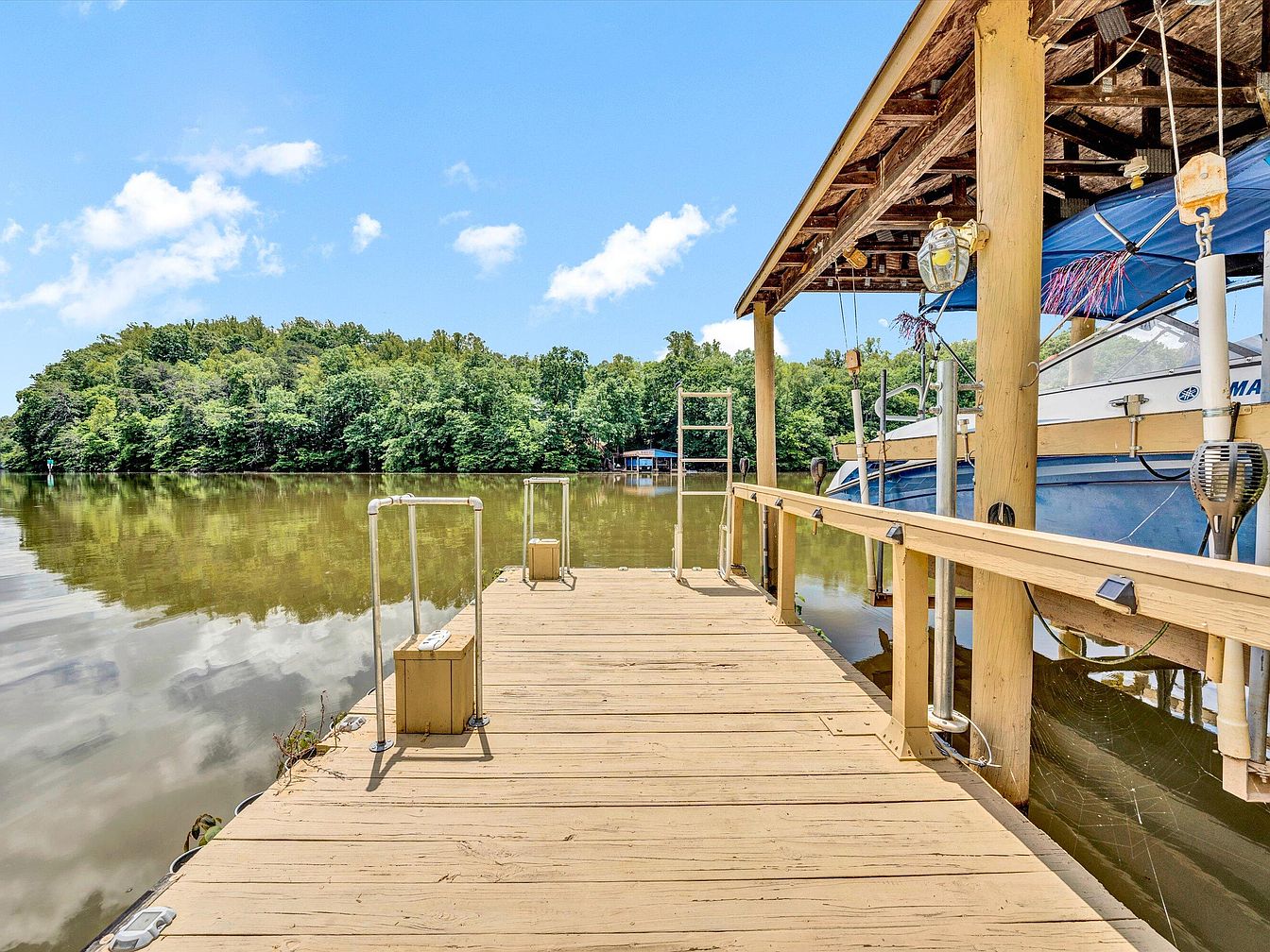 This peaceful lakefront dock features a spacious wooden platform extending over calm waters, perfect for boating or relaxation. The dock is constructed with natural-toned planks, harmonizing with the surrounding lush greenery seen across the lake. A well-built covered boat slip with exposed sturdy timber beams offers shelter and protection for watercraft. Metal railings and fixtures add subtle modern touches while ensuring safety. The dock’s serene waters reflect the blue sky and trees, creating a tranquil atmosphere for outdoor enjoyment and water activities. Ideal for lake living enthusiasts seeking both functionality and nature connection.