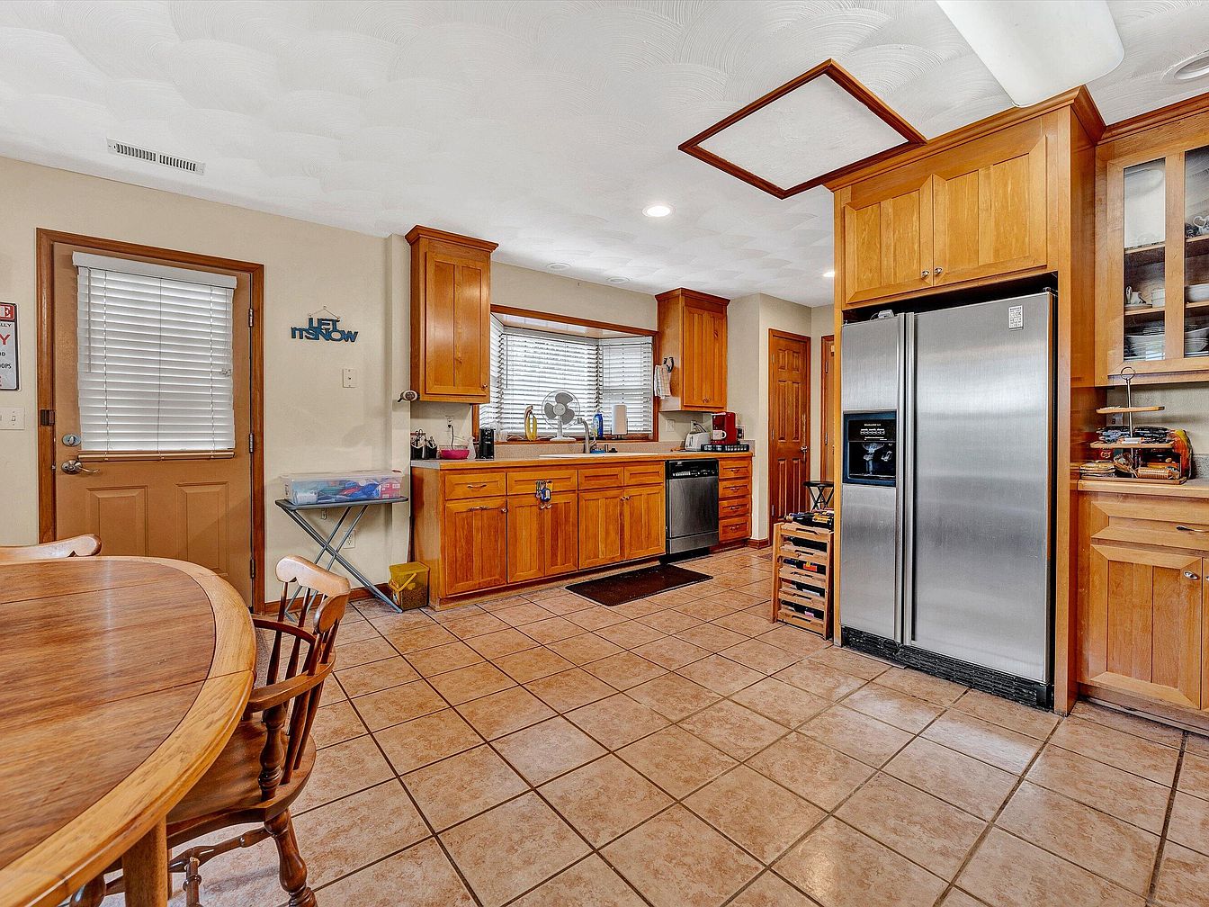 This spacious kitchen features a warm, earthy color palette dominated by natural wood cabinets and furniture, blending well with the tan tiled floor. The cabinetry offers ample storage, with a combination of solid wood doors and glass displays. Stainless steel appliances, including a large side-by-side refrigerator and a dishwasher, add modern functionality while contrasting nicely with the wood tones. A window above the sink brings natural light to the workspace, and the dining area with a round wooden table and chairs invites casual meals. The layout promotes easy movement and practical use of space.