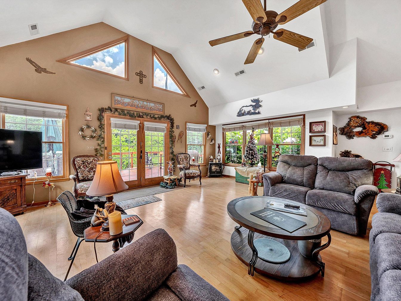 This living room features a vaulted ceiling with contemporary triangular windows allowing abundant natural light and a view of the sky. The walls combine earthy brown and bright white tones, creating a warm and inviting atmosphere. Comfortable gray upholstered sofas and an oval dark wood coffee table anchor the seating area, complemented by floral-patterned vintage armchairs near the French doors. The wood floor enhances the natural, cozy feel, while decor accents like a ceiling fan with wooden blades, rustic wall art, and a small Christmas tree add character and seasonal charm to the space. Large windows bring in greenery views, enhancing the airy ambiance.