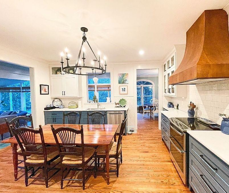 This space melds a cozy dining area with a functional kitchen. The warm wooden dining table paired with traditional spindle-back chairs anchors the center, positioned under a wrought-iron chandelier with candle-style lights. The kitchen features a blend of muted blue lower cabinets and white upper cabinetry, offering a serene yet inviting palette. Crisp white countertops and a subway tile backsplash add a clean, classic touch, while a standout wooden range hood introduces an artisanal quality. The flooring is a medium-toned wood, enhancing warmth throughout. Large windows fill the room with natural light, connecting the kitchen to adjacent living and dining areas for open flow and brightness.