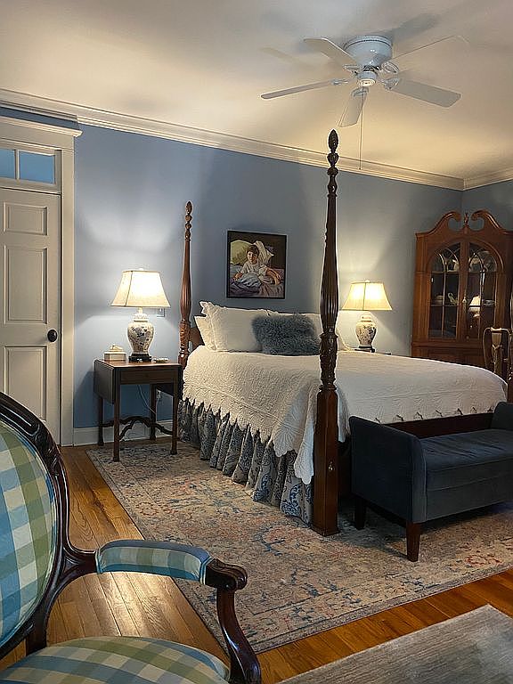 This serene bedroom features soft blue walls that create a calming atmosphere, enhanced by white crown molding and a matching ceiling. A classic four-poster bed dominates the room, draped in crisp white bedding with a textured pattern and a dark blue bed skirt. Twin bedside tables hold elegant ceramic lamps with floral designs, providing warm, ambient lighting. A vintage wooden china cabinet adds character along one wall, complementing the traditional design aesthetic. The room’s hardwood floors are partially covered by a large, muted area rug. Additional accommodations include a plush navy bench at the foot of the bed and a stylish checkered armchair, blending comfort with timeless charm.