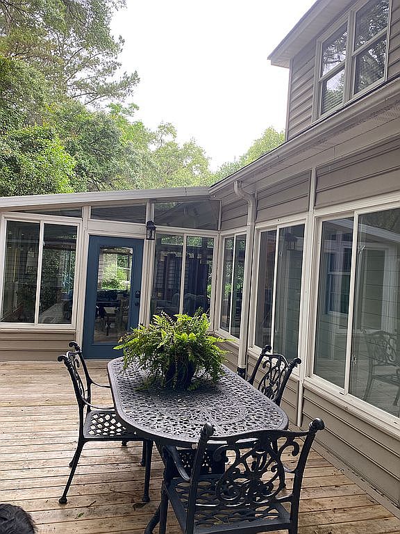 This inviting outdoor patio features a wooden deck with a classic wrought iron dining set, including a rectangular table and four intricately designed chairs. A lush green fern centerpiece adds a touch of nature and freshness to the table, complementing the surrounding greenery visible beyond the patio. The home’s exterior showcases beige horizontal siding with multiple large windows, allowing plenty of natural light to flow indoors. A blue door with glass panels provides an attractive contrast and leads into the home, enhancing the seamless indoor-outdoor living connection. The space feels peaceful and perfect for outdoor meals or gatherings.