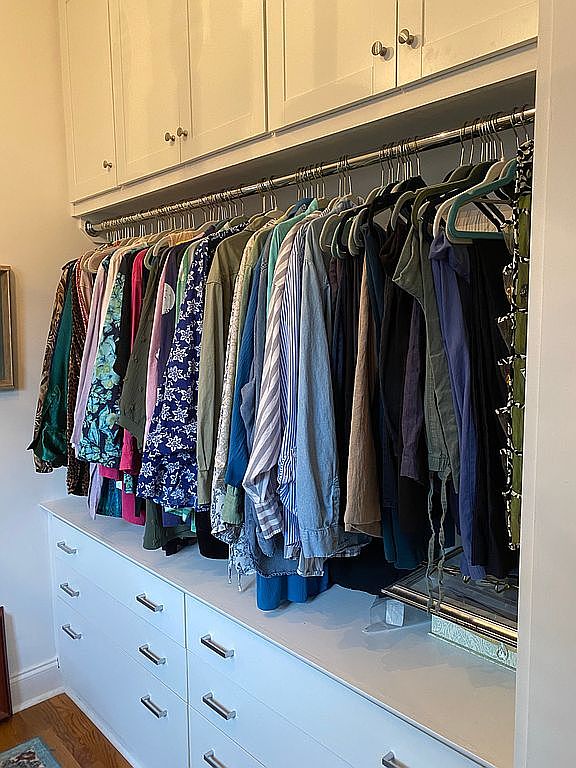 This well-organized closet area features a long hanging rod filled with an array of shirts, blouses, and jackets in varying colors and patterns, predominantly cool blues, greens, and neutrals. Above the hanging rod, a row of sleek, white cabinetry with metallic knobs provides additional storage space, enhancing the clean, streamlined look of the area. Below the hanging clothes, multiple white drawers with modern silver handles offer ample storage for folded clothing or accessories. The warm wood floor contrasts subtly with the white cabinetry, creating a balanced, inviting space aimed at functionality and tidy aesthetic appeal.