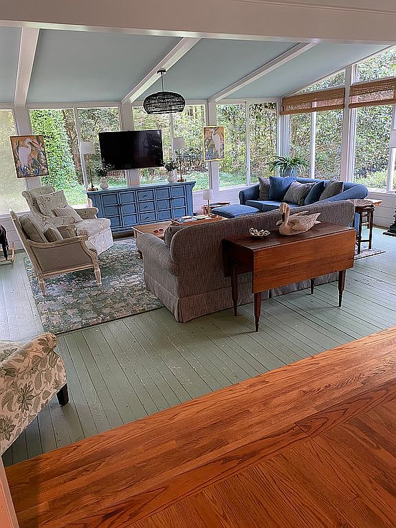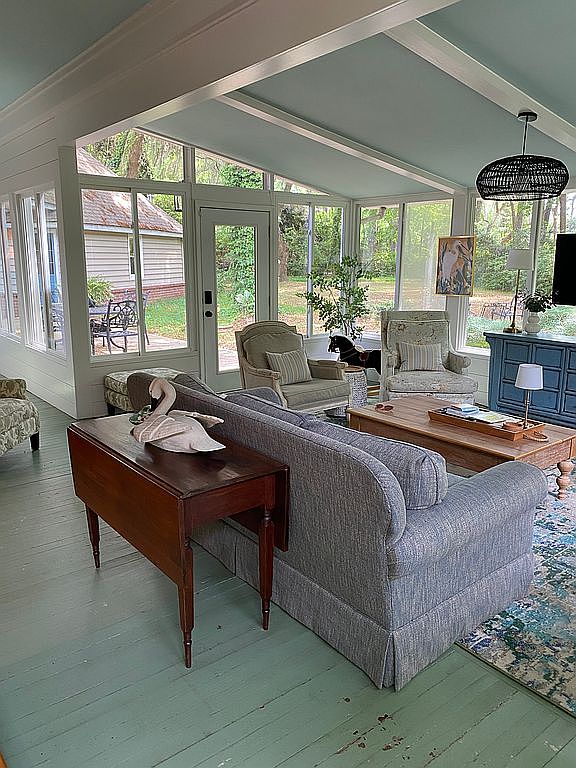 This bright sunroom living area features expansive windows that stretch from floor to ceiling, offering abundant natural light and a seamless connection to the lush greenery outside. The room’s vaulted ceiling with exposed white beams enhances the spacious and airy atmosphere. Soft, muted colors dominate, with pale green floors complementing the gray upholstered sofa and neutral-toned armchairs, creating a calm and inviting seating arrangement centered around a rustic wooden coffee table. A vintage-style wooden drop-leaf table behind the sofa adds warmth, while a blue sideboard and pendant light contribute subtle pops of color and charm to the cozy, nature-inspired space.