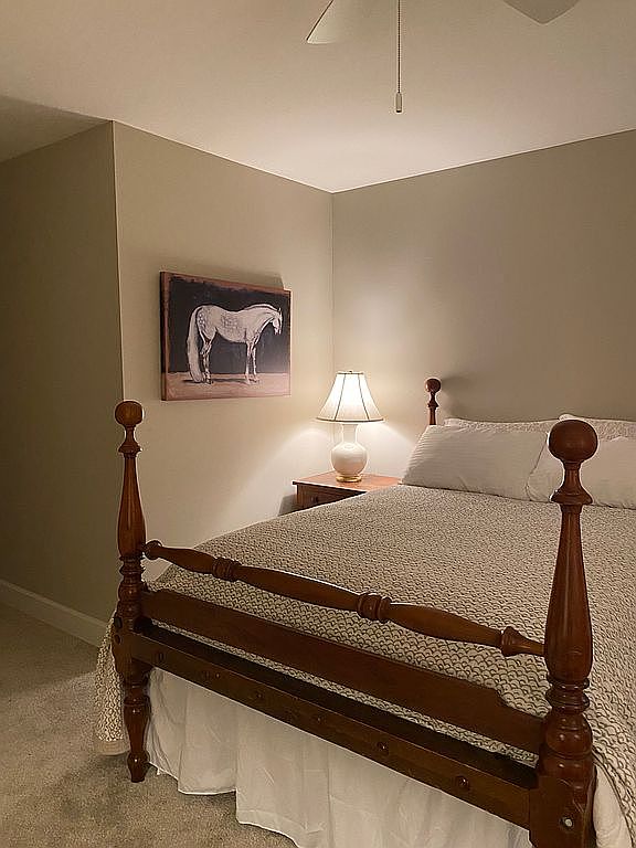 This intimate bedroom corner features a classic wooden bed frame with turned posts, dressed in a textured beige bedspread and crisp white pillows, creating a warm and inviting atmosphere. Soft neutral walls complement the warmth of the wood tones, while a small wooden nightstand holds a traditional white ceramic lamp emitting a soft, ambient glow. A simple yet striking horse artwork adds character and a hint of rustic charm, bringing a peaceful and grounded feel to the space. The layout promotes tranquility and comfort, balancing simplicity with thoughtful decor elements.