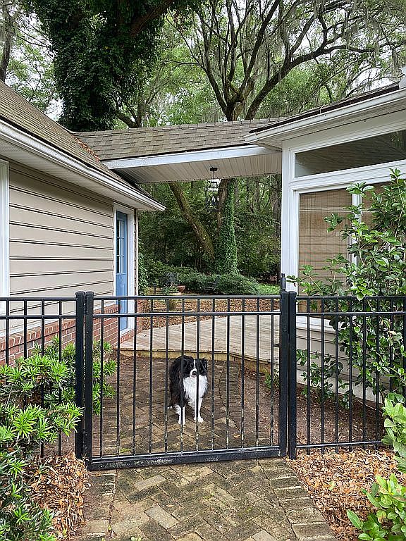 This charming front entrance patio offers a cozy and secure outdoor space. A black metal gate with vertical bars encloses the small brick-paved area, providing a safe zone for pets or children. The brick pathway leads up to a blue door set into a beige horizontal siding wall, adding a pop of color against the natural, earthy tones. To the right, a large window framed in white lets in ample natural light, and is complemented by green shrubbery and leafy trees, lending a serene woodland feel. Overhead, the roofline connects different parts of the structure, creating an inviting covered walkway.