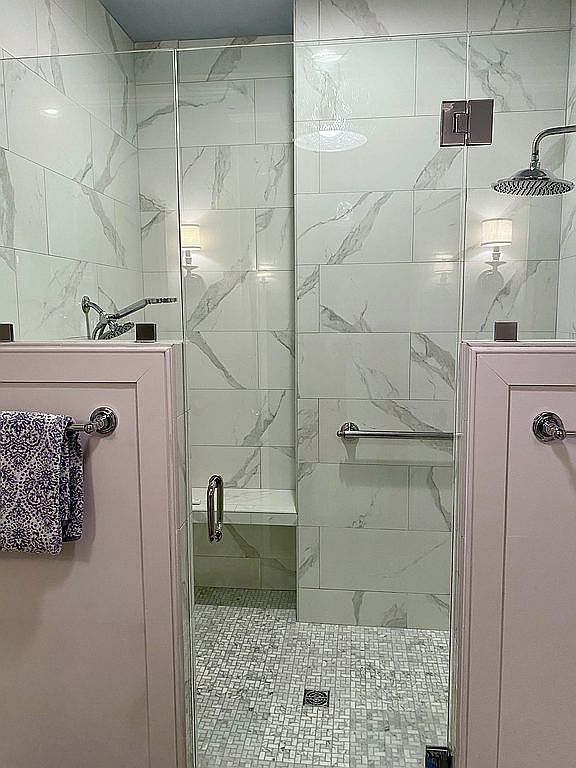 This walk-in shower presents a sleek, modern design framed by large marble-patterned wall tiles that exude a luxurious feel. The floors feature small square mosaic tiles in various shades of grey, adding subtle texture and contrast beside the smooth walls. Two half walls painted in a soft cream or light beige color flank the glass door, equipped with chrome towel bars and contemporary fixtures. A built-in corner bench provides convenient seating, while the rain showerhead and additional faucet reflect a spa-inspired aesthetic. Soft wall sconces outside the shower add warmth and elegant lighting to complement the clean, fresh atmosphere.