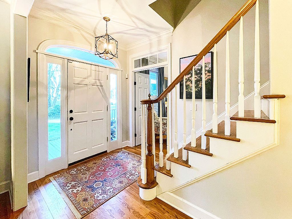 This welcoming entryway features a classic white front door framed by sidelights and an arched transom window that flood the space with natural light. The rich hardwood flooring contrasts beautifully with the soft, neutral wall colors, establishing a warm and inviting atmosphere. A detailed, patterned area rug adds vibrant color and texture beneath the doorway. The traditional staircase has wooden treads and white balusters, topped by a polished wooden handrail that complements the flooring. A geometric pendant light fixture adds modern charm, while an adjacent room is visible through an open doorway, enhancing the sense of openness and flow.