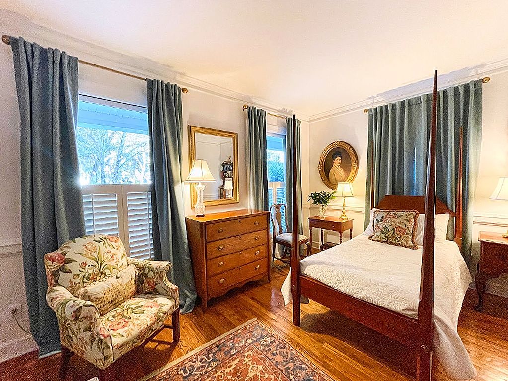 This cozy bedroom corner features a warm, inviting atmosphere with classic wooden furniture. The four-poster bed, dressed in crisp white bedding with a decorative floral pillow, serves as the room’s centerpiece. A floral-patterned armchair adds a touch of vintage charm by the window, which is framed with long, elegant teal curtains and white plantation shutters. Two wooden dressers flank the bed, topped with traditional lamps emitting a soft glow. A decorative gold-framed mirror and a classic round portrait on cream-colored walls enhance the timeless feel. Rich hardwood floors and a patterned area rug complete the traditional aesthetic.