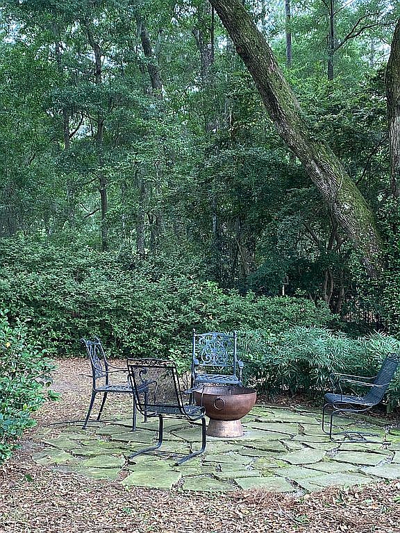 This outdoor space features a cozy, circular stone patio nestled amidst dense greenery and tall trees, providing a natural and serene ambiance. Four metal chairs, each with a distinct design, surround a central fire pit, suggesting a spot for intimate gatherings or quiet reflection. The stone patio is composed of irregularly shaped stones, blending seamlessly with the earthy tones of the surrounding foliage. The area is framed by abundant bushes and shrubbery, creating a private, shaded retreat that invites relaxation while enjoying the beauty of nature. The mix of rustic elements fosters a peaceful, inviting atmosphere.