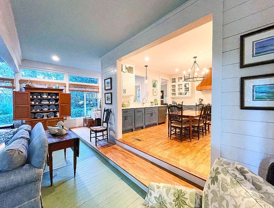 This space combines a cozy kitchen and dining area with an adjacent sitting room. The kitchen features a warm wooden floor, contrasted by white and dark cabinetry, giving a modern yet rustic charm. A central wooden dining table surrounded by black chairs anchors the area, illuminated by a black chandelier and pendant lighting. The slightly elevated kitchen creates a distinct separation from the sitting space, where a soft blue sofa and vintage wooden furniture offer comfort. Natural light streams through large windows, enhancing the light color scheme and creating a welcoming, fluid transition between cooking, dining, and relaxing zones.
