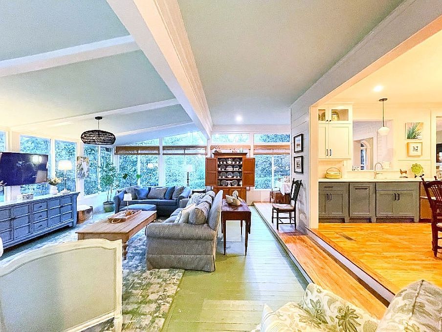 This open-concept space combines a spacious living room and an adjacent kitchen, separated by a slight step up enhancing the architectural interest. The living area features vaulted ceilings with exposed beams painted in a soft light blue, complementing the natural light flooding through large windows that offer views of lush greenery outside. Furnishings include a long gray sofa, wooden coffee table, and a blue sideboard beneath a mounted flat-screen TV. The kitchen’s warm wood flooring contrasts with the green painted floor of the living room, and its cabinetry blends muted gray and off-white tones, all under modern pendant lighting, creating a seamless flow between both areas.