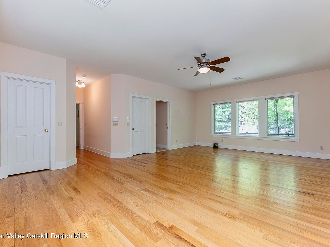 This living room features an open, airy layout with smooth, light wooden floors that add warmth and subtle texture. Walls are painted in a soft, neutral beige, enhancing the room’s bright and welcoming atmosphere. Three large windows along one wall flood the space with natural light and offer serene views of greenery outside. White trim and baseboards frame doors and windows, adding a crisp contrast. A ceiling fan with wooden blades is centrally placed, combining functionality with classic design. The room’s simplicity allows for versatile furnishing and decor options, ideal for comfortable living.