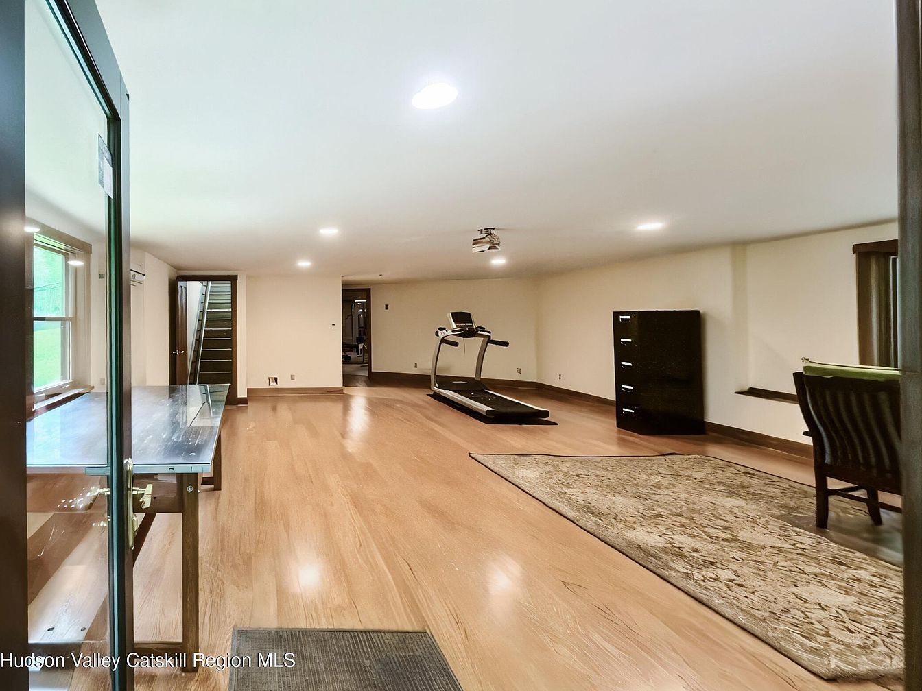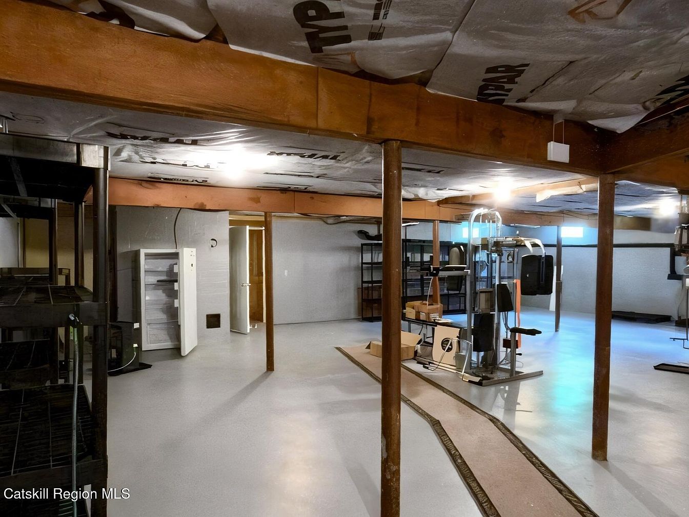 This spacious basement reveals a multipurpose area with exposed wooden beams and support poles that add rustic charm. The ceiling is partially covered with insulation material, offering a raw, unfinished look. Light grey epoxy-coated flooring creates a clean, durable surface ideal for exercise and storage. The space features fitness equipment centrally located beside shelving units for organization. A small doorway and an open refrigerator give a glimpse of utility and storage convenience. Natural light filters through narrow, high windows lending bright, airy vibes to an otherwise industrial, functional setting.