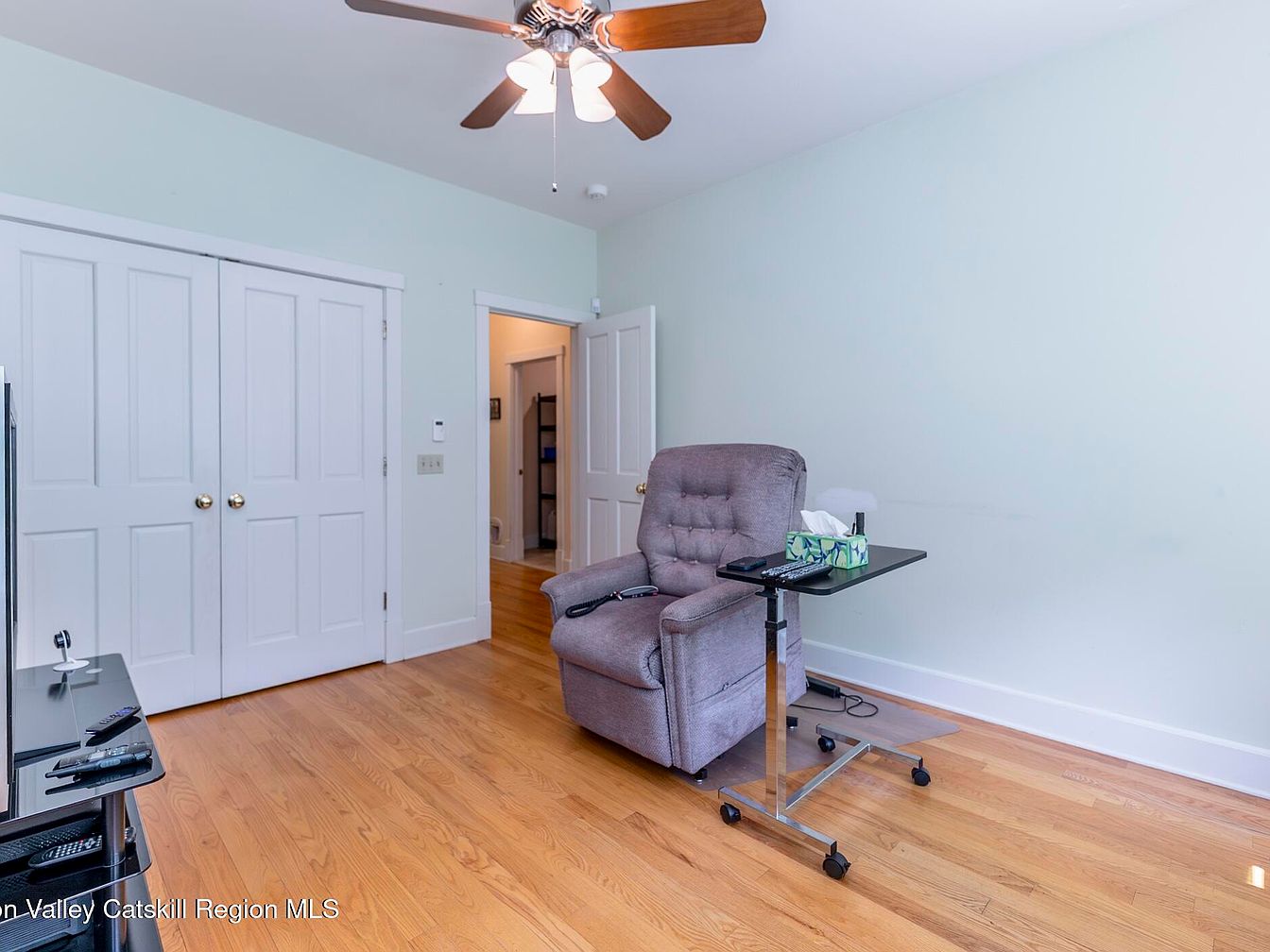 This inviting corner of the living area features light pastel walls paired with warm, natural hardwood flooring, creating a soft yet welcoming ambiance. A plush, gray recliner chair is positioned next to a modern, black rolling side table holding a tissue box and remote controls, emphasizing comfort and convenience. The room includes classic white paneled double closet doors and a single door leading to an adjacent hallway, adding functional storage and easy access. A ceiling fan with wooden blades and soft lighting enhances air circulation and a cozy atmosphere, blending practicality with simple, clean design.
