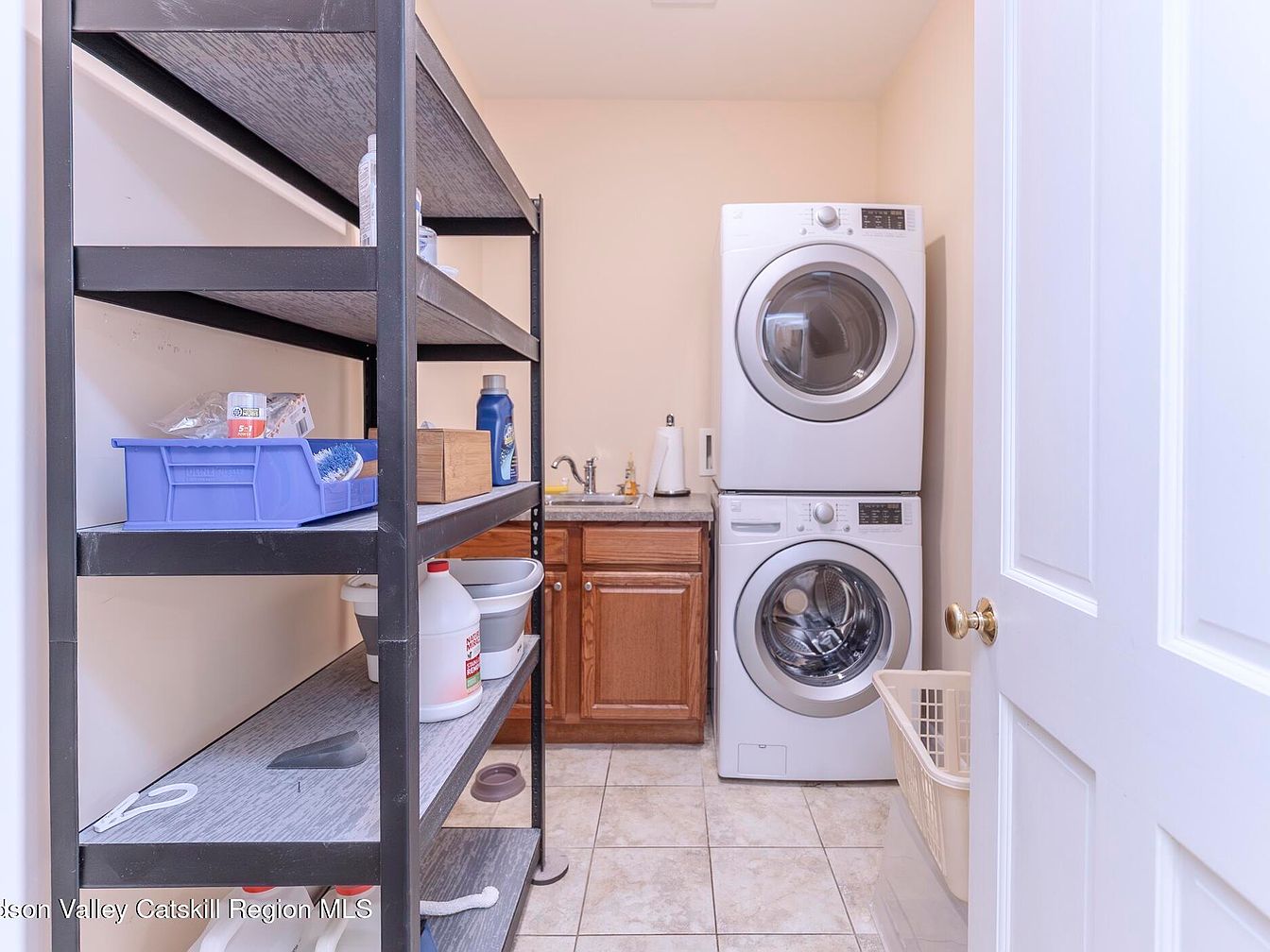 This compact laundry room efficiently utilizes its space with practical organization and essential appliances. A stacked washer and dryer sit against a soft beige wall, maximizing floor space while maintaining access to controls. Adjacent to the machines, a small countertop with a sink is mounted on rich wood cabinetry, providing functional workspace and concealed storage. The floor is covered with light-colored tiles that complement the neutral wall tone. A sturdy black shelving unit lines the left wall, holding various laundry supplies and cleaning products. Soft natural light brightens the room, creating a clean and orderly atmosphere ideal for household chores.