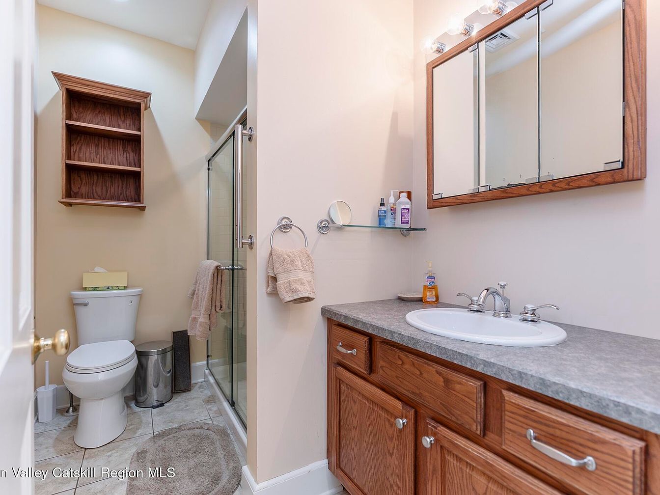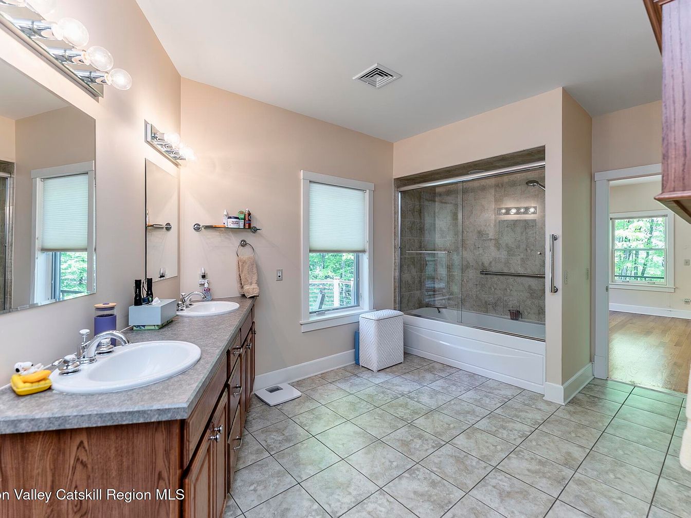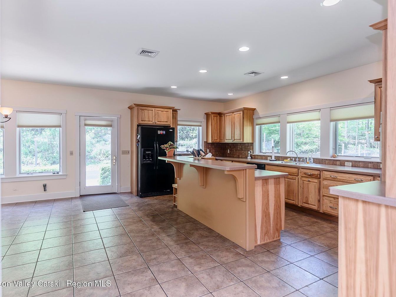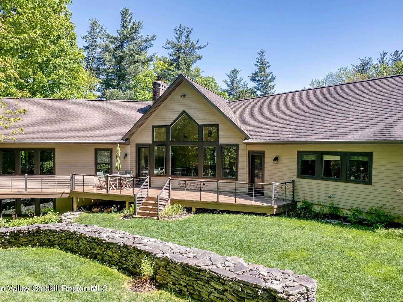 This fantastic contemporary home, located at 77 Jomar Lane in Olivebridge, NY, is nestled on a sprawling 10.90-acre forested property featuring a rambling streamside setting. The house showcases an architectural style characterized by large windows that flood the interiors with natural light, vaulted ceilings, and a harmonious blend of natural materials, including a brick gas-burning fireplace that anchors the great room. The home comprises 3 bedrooms and 2.5 bathrooms, including a huge primary ensuite and two generously sized bedrooms sharing a bathroom, all situated conveniently on the first floor. Gleaming hardwood flooring extends throughout the main living areas, complementing the huge gourmet kitchen that features a center island, recessed lighting, and ample cabinet space—ideal for culinary enthusiasts. A lower level walkout with a half bath enhances the living space, while a large unfinished basement area presents excellent potential for a home gym or additional storage. Practical amenities include an attached two-plus car garage, a dog run, and two fenced acres for pets to roam freely. The 10.90 acres consist of two parcels—a 5-acre lot with the house and an adjoining 5.90-acre parcel for expanded outdoor enjoyment. Priced at $995,000, this home offers a unique combination of contemporary design, significant land, and modern living comforts in the beautiful Catskill region.