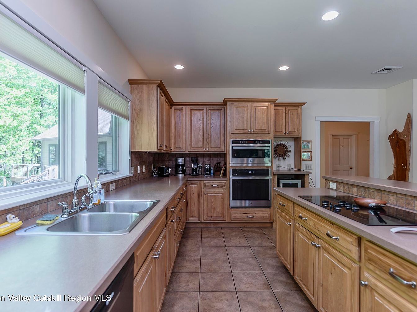 This kitchen features a spacious U-shaped layout with abundant cabinetry and countertop space. The natural wood cabinets have a classic raised-panel design, complemented by beige countertops and brown tiled backsplash that add warmth. A double stainless steel sink is positioned under large windows with white trim, allowing ample natural light to brighten the room. The floor is covered with neutral-toned large ceramic tiles, enhancing the earthy palette. Built-in stainless steel appliances include a double wall oven. Recessed ceiling lights provide bright, even illumination, creating a functional and inviting cooking area.