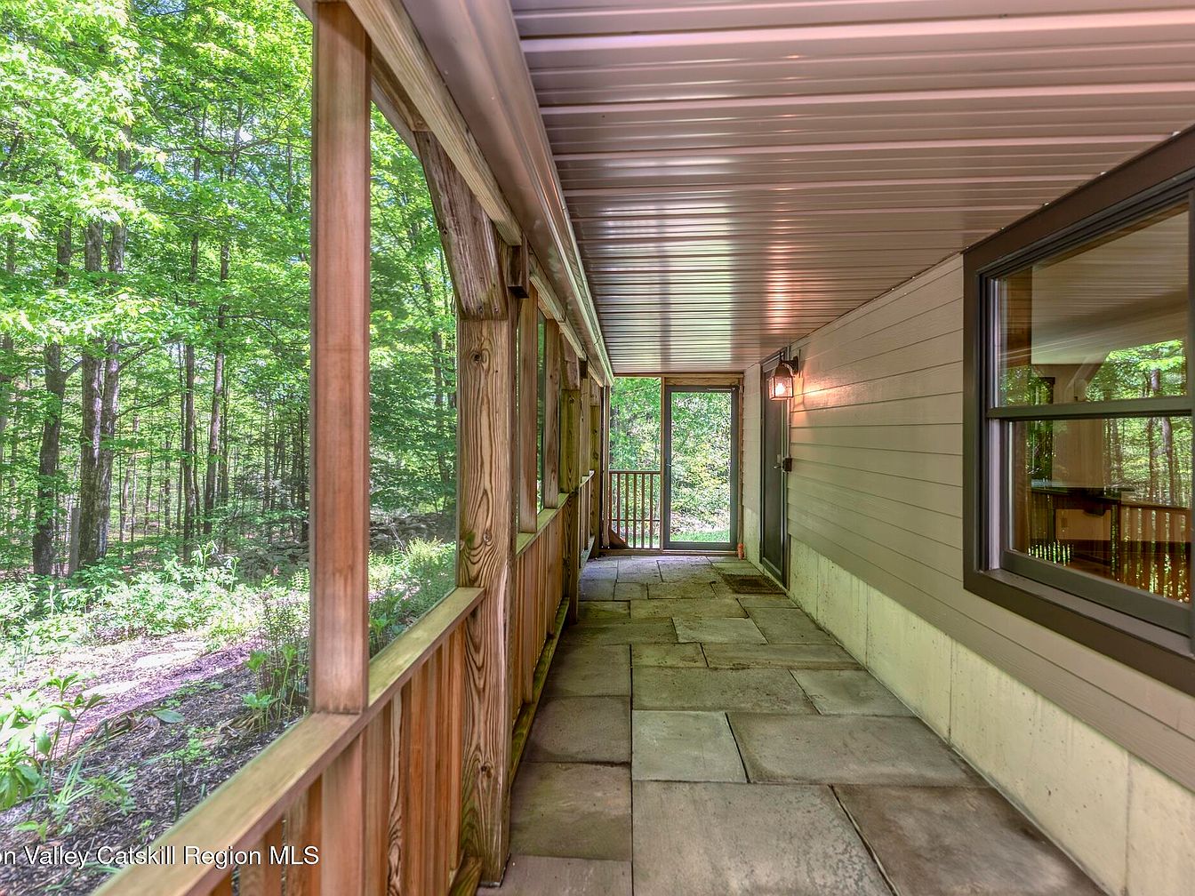 This screened porch offers a serene transition between the indoor living spaces and the surrounding natural landscape. Featuring a stone tile floor with large, earthy square slabs, the floor adds a rustic yet polished feel. The wooden screened frames provide unobstructed views of lush greenery, creating a peaceful, nature-filled ambiance. The ceiling is finished with a smooth, beadboard-style design painted in a soft white that brightens the covered space. The beige siding with dark brown trim complements the natural wooden elements, while a single wall light near the door adds subtle, warm illumination for evening enjoyment.