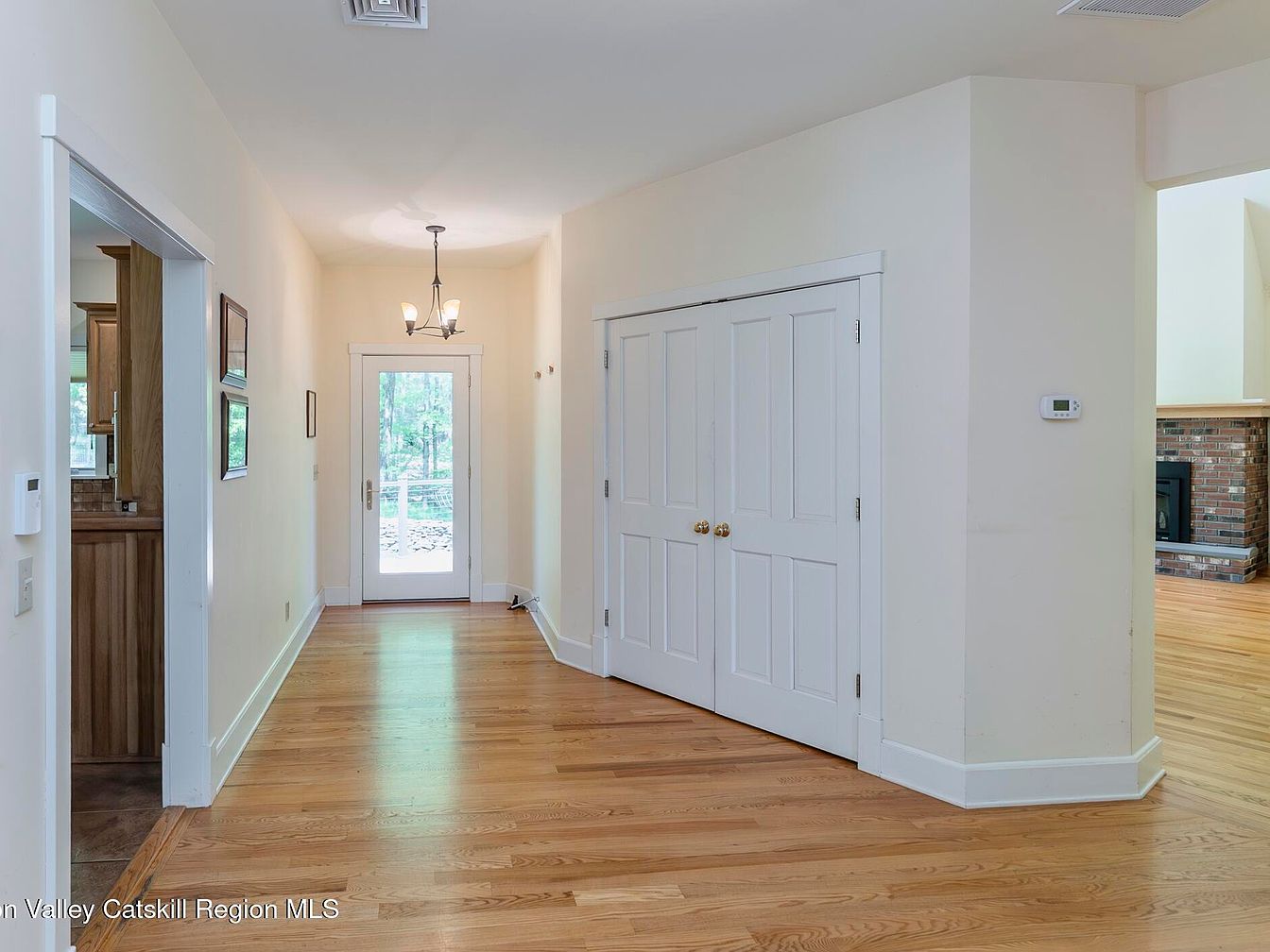 This entryway features warm, natural hardwood flooring that extends into adjacent spaces, creating a cohesive flow. Soft white walls contrasted by crisp white trim and door frames amplify the natural light coming through the full glass panel door at the hall’s end. A small chandelier with warm light adds an inviting ambiance overhead. To the right, a set of double white paneled doors likely opens to a closet for convenient storage. On the left, an open doorway leads to a kitchen space with visible wood cabinetry, while a glimpse of a brick fireplace in the adjoining room hints at cozy living quarters beyond.
