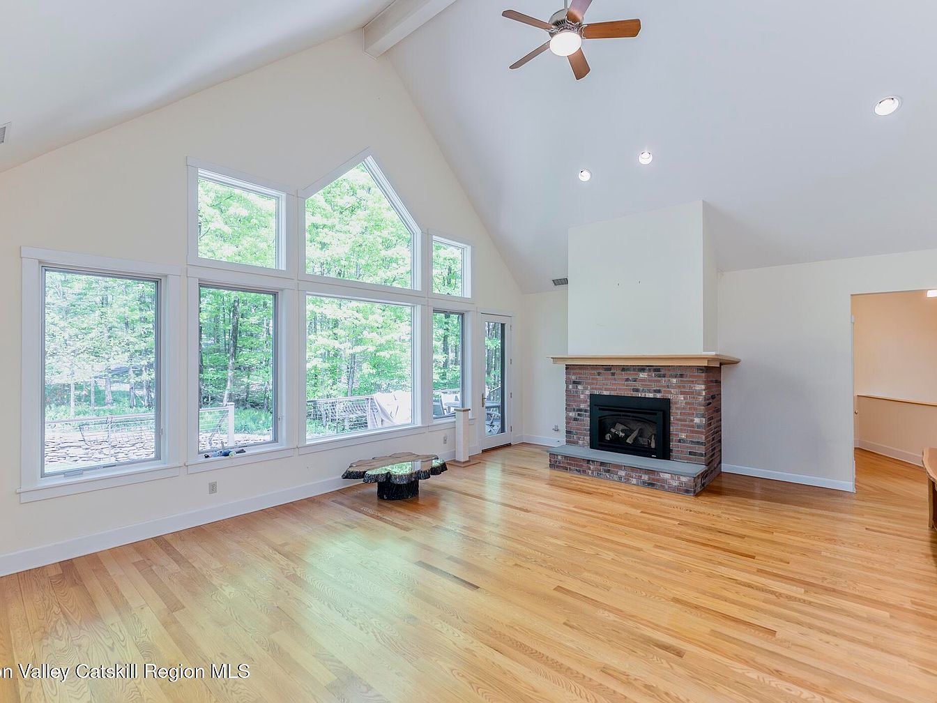 This spacious living room features a vaulted ceiling with a modern ceiling fan that enhances airflow. Large, geometric windows along one wall flood the room with natural light while offering a serene view of the woodland outside. The warm honey-toned hardwood floor adds a cozy yet elegant feel to the space. A central brick fireplace with a wooden mantel serves as a focal point, contributing rustic charm and warmth. Neutral off-white walls keep the room bright, creating an inviting atmosphere perfect for relaxation or entertaining.