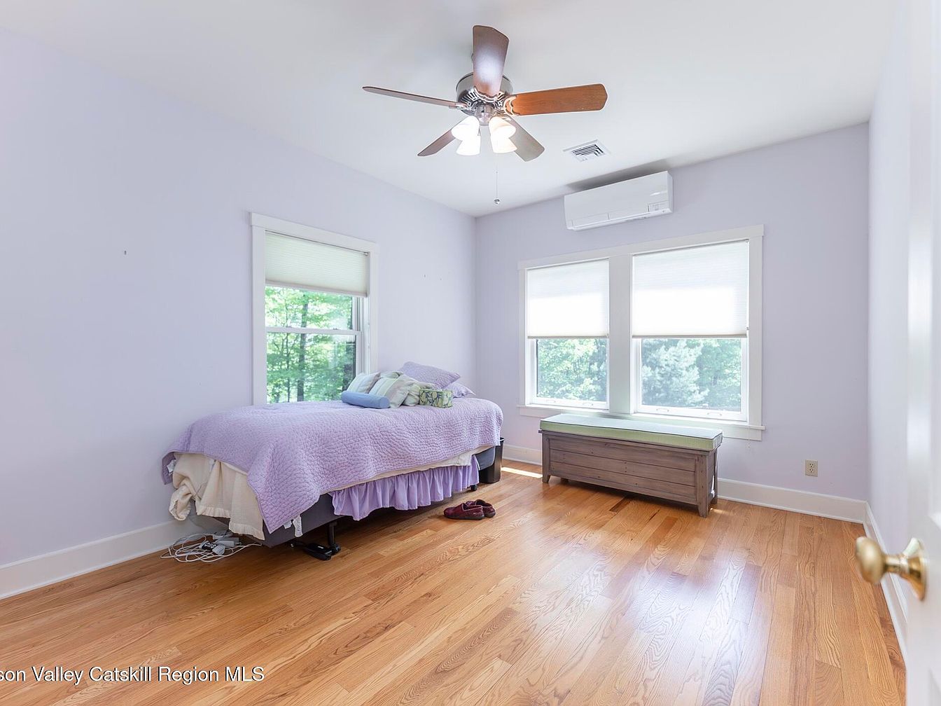 This cozy bedroom features light lavender walls that create a calming ambiance, paired with warm, polished hardwood floors. A single bed with layered bedding in shades of purple and pastel accents comfortably rests against the left wall. Two large windows adorned with simple white roller blinds flood the room with natural light, enhancing the airy feel. Beneath the windows is a wooden storage bench with a green cushion, offering additional seating and functionality. A ceiling fan with wooden blades and integrated lights hangs overhead, while an efficient wall-mounted air conditioning unit maintains comfort. Minimalist and inviting, this bedroom balances simplicity with soft, soothing colors.