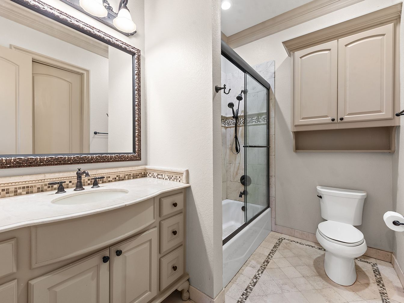 This bathroom features a balanced design with warm neutral tones. The vanity has cream-colored cabinetry with classic black hardware, topped by a rich, dark marble countertop that adds a touch of elegance. Above the sink, a large ornate framed mirror complements the dark oil-rubbed bronze faucet. Opposite the vanity is a framed glass shower door enclosing a bathtub with beige tiled walls and a decorative mosaic tile inset, providing visual interest. A small cream cabinet is mounted above the toilet offering extra storage, and a black towel bar is conveniently attached to the shower door for functionality.