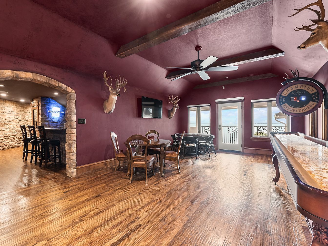 This spacious game room features rich burgundy walls and ceiling, complemented by dark wooden beams and polished hardwood floors that lend warmth and sophistication. Mounted deer heads and rustic elements enhance its lodge-inspired aesthetic. A shuffleboard table stretches along one side, inviting interactive fun, while two seating areas include a round wooden card table with matching chairs and a black folding table near the windows. The far wall has large windows and a door opening to a balcony with an iron railing, allowing natural light to brighten the space. Stone archways lead to an adjoining bar area with high stools and a beverage cooler, completing the entertainment hub vibe.