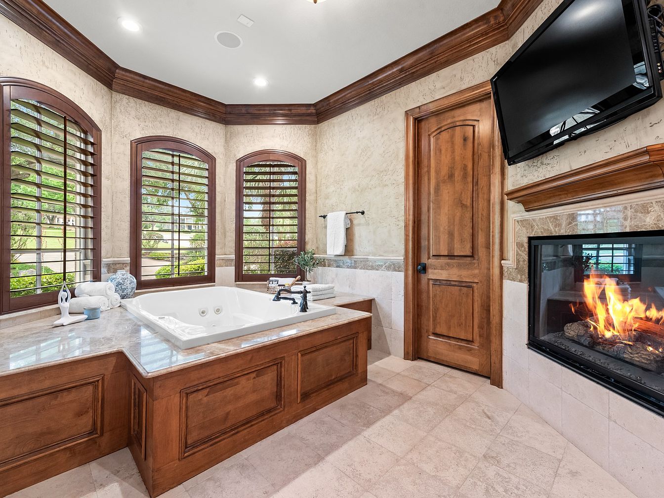 This luxurious bathroom features a large soaking tub framed by rich wood paneling and a polished marble surround, creating a warm, inviting focal point. Three tall, arched windows with wooden plantation shutters allow ample natural light to soften the neutral beige and cream tones on textured walls and tiled floors. A cozy fireplace with a marble mantel enhances the space’s relaxing atmosphere, while a mounted flat-screen TV adds modern convenience. Detailed crown molding and a solid wooden door amplify the room’s elegant, classic aesthetic, blending comfort with refined style for a true spa-like experience.