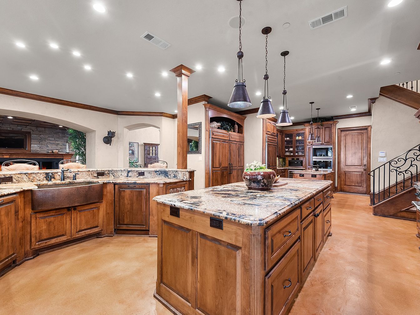 This expansive kitchen features a large island centerpiece with a polished granite countertop, rich in natural stones and subtle veining. The cabinetry is crafted from warm, medium-tone wood, extending throughout the kitchen for a cohesive look. Four industrial-style, dark metal pendant lights hang over the island, adding a rustic charm. The flooring has a smooth, earth-toned finish, complementing the woodwork and granite hues. In the background, built-in appliances and a second countertop provide functional workspace. Trimmed doorways and crown molding with a darker wood finish enhance the sophisticated, warm ambiance of the space.