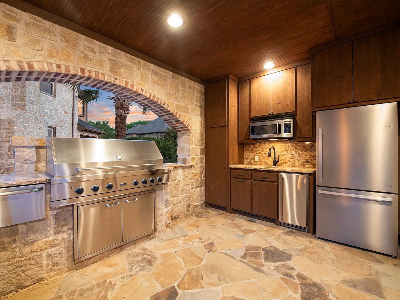 This outdoor kitchen blends rustic charm with modern convenience, featuring natural stone flooring and walls framed by a graceful stone arch that opens to the backyard. The ceiling is clad in rich, warm wood, complementing the dark wood cabinetry along one wall. Stainless steel appliances, including a large built-in grill, refrigerator, microwave, and dishwasher, create a sleek contrast against the textural stone and wood elements. The granite countertops add a refined touch, while recessed ceiling lights ensure ample illumination for evening gatherings in this inviting, functional cooking and entertaining space.