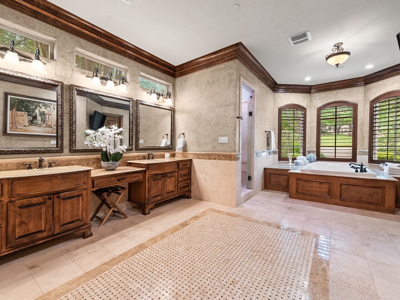 This master bathroom impresses with its spacious layout and refined rustic elegance. The space features dual wooden vanities with rich, warm cabinetry and ornate framed mirrors above, complemented by three wall-mounted light fixtures. A built-in makeup vanity sits seamlessly between the sinks, accompanied by a folding stool. The neutral color palette blends creamy beige tones in the tile flooring, intricate mosaic accents, and textured walls with wooden crown molding and window trim. Arched windows with wooden shutters allow natural light to flood the area where a large built-in bathtub with matching wood paneling offers a serene view of the lush greenery outside, creating an inviting spa-like ambience.
