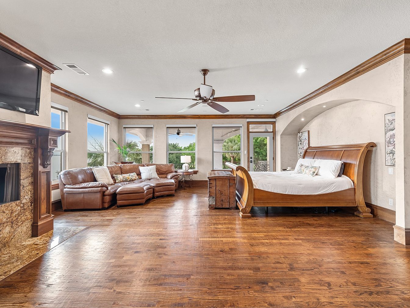 This spacious master bedroom features warm, natural wood flooring complemented by rich wood crown molding and baseboards, framing the soft beige walls. The room includes a large wooden sleigh bed positioned in a curved alcove, accentuating the architectural detail. A cozy brown leather sectional sofa is placed by multiple large windows, inviting natural light and a lush outdoor view. A rustic chest at the foot of the bed adds charm, while the ceiling fan with dark wood blades and recessed lighting enhance comfort and ambiance. The fireplace with a granite surround and mounted TV completes this elegant retreat.